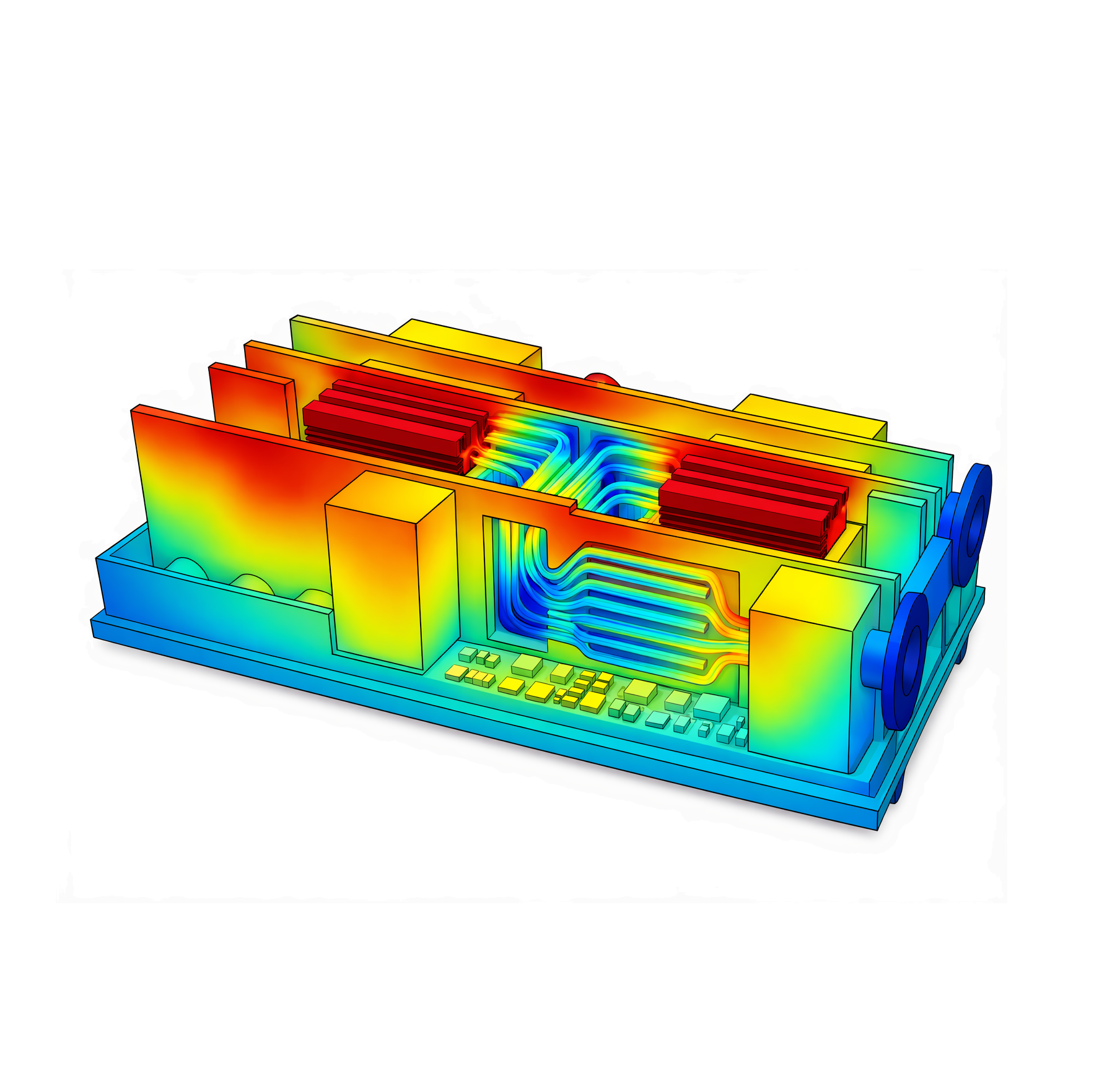 AALC(Air-Assisted Liquid Cooling)란 액체가 열을 회수하고 공기가 최종 배출을 담당하는 구조입니다. CPU, AI 프로세서, NIC 등 주요 발열원에 직접 접촉한 콜드플레이트가 열을 냉각수로 흡수하고, 가열된 냉각수는 서버 내장 라디에이터를 거쳐 공기 중으로 열을 방출합니다. 방출된 열은 데이터센터의 기존 공조 시스템이 처리하므로, 별도의 시설 배관 연결 없이도 기존 공랭 인프라에 유연하게 도입할 수 있습니다. 냉각 유로 전반은 유동해석 기반으로 최적화해 높은 냉각 효율과 안정적인 운영을 구현했습니다.