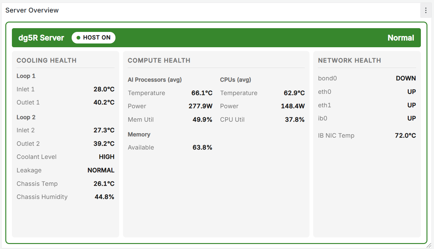 서버 상태를 Normal·Warning·Critical 배경색으로 즉시 파악합니다. 냉각(Inlet/Outlet/ΔT·누수·레벨), AI 프로세서, CPU, 네트워크 링크 상태를 항목별로 한 패널에 요약합니다.