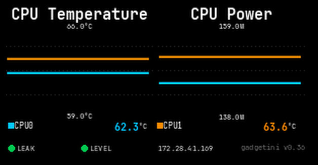 웹 기반 모니터링 소프트웨어 gadgetini는 Overview · Cooling Health · Compute Health · Network Health · History · Alerting의 6개 전용 패널로 서버 전체 상태를 한눈에 보여줍니다. Normal · Warning · Critical 색상 체계로 이상 여부를 즉시 파악할 수 있으며, 루프별 냉각수 온도·레벨·누수 상태는 물론 CPU 및 AI 프로세서의 전력·활용률·온도, 메모리 활용률, NIC 링크 상태와 InfiniBand 칩셋 온도까지 실시간으로 추적합니다. 또한 24시간 이력 그래프를 통해 이상 발생 시점을 역추적할 수 있고, 임계값 초과 시 이메일 및 Slack 알림을 즉시 발송할 수 있습니다.